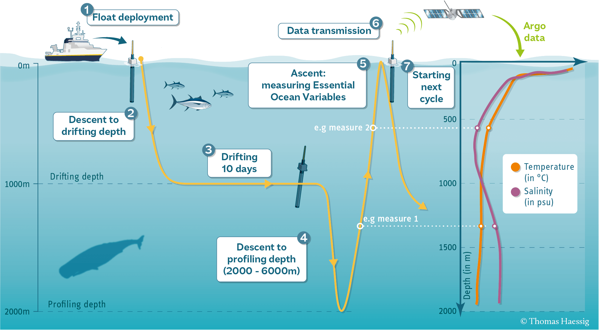 Biogeochemical Argo (βBio-Argoβ or BGC-Argo) floats are autonomous profiling instruments that drift with ocean currents and periodically dive from the surface to depths of 1,000β2,000 meters, collecting a vertical profile of physical and biogeochemical properties. These floats are all over the worldβs oceans and the data are freely available via the Argo global data assembly centers (GDACs) Video on the Argo system.